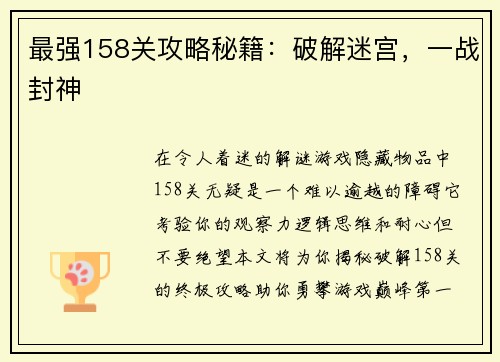 在令人着迷的解谜游戏《隐藏物品》中,158关无疑是一个难以逾越的障碍。它考验你的观察力、逻辑思维和耐心。但不要绝望,本文将为你揭秘破解158关的终极攻略,助你勇攀游戏巅峰。